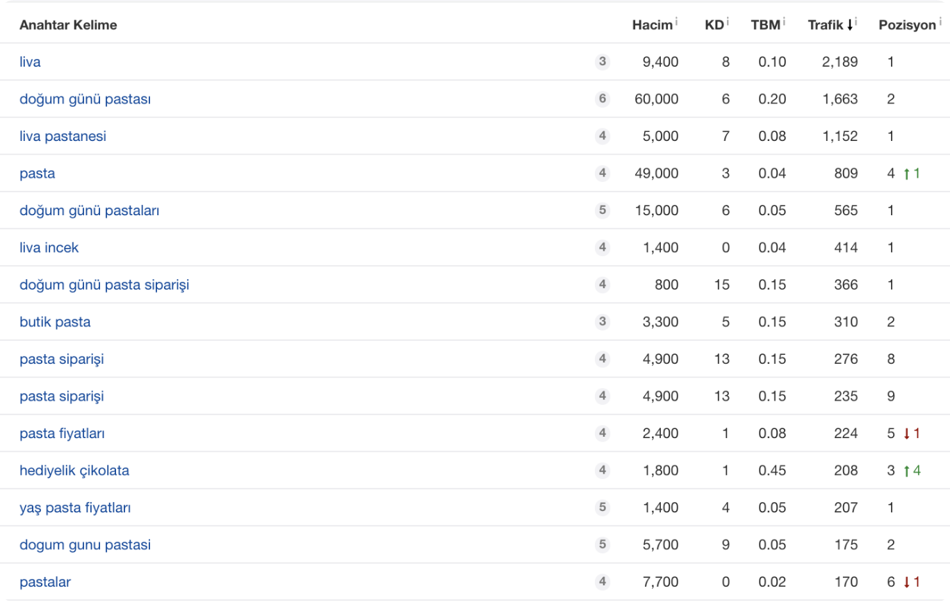 As seen in the graphic below, we are positioned in the top 3 in target words such as "birthday cake", "liva", "order cake" in the sector. In addition, we receive traffic from search engines in a total of 11,312 words.